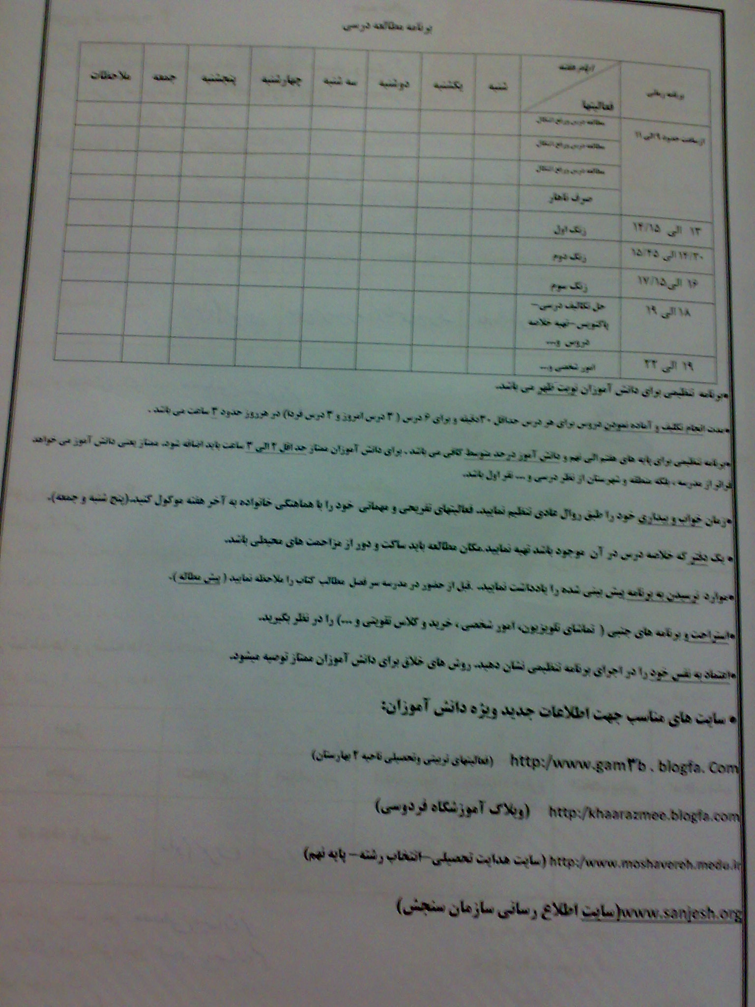 نمونه برنامه جهت مطالعه دروس(نوبت بعد از ظهر)